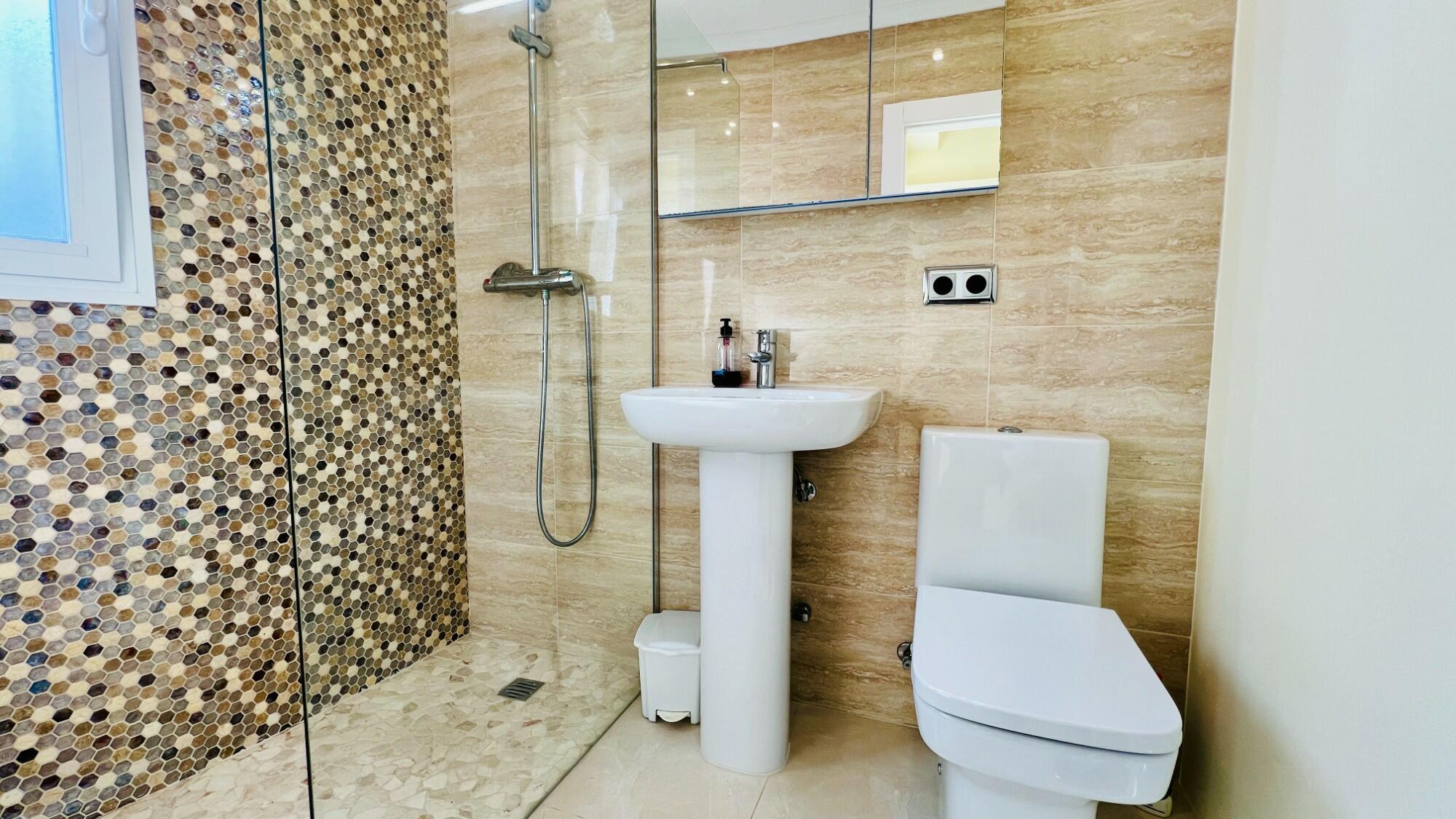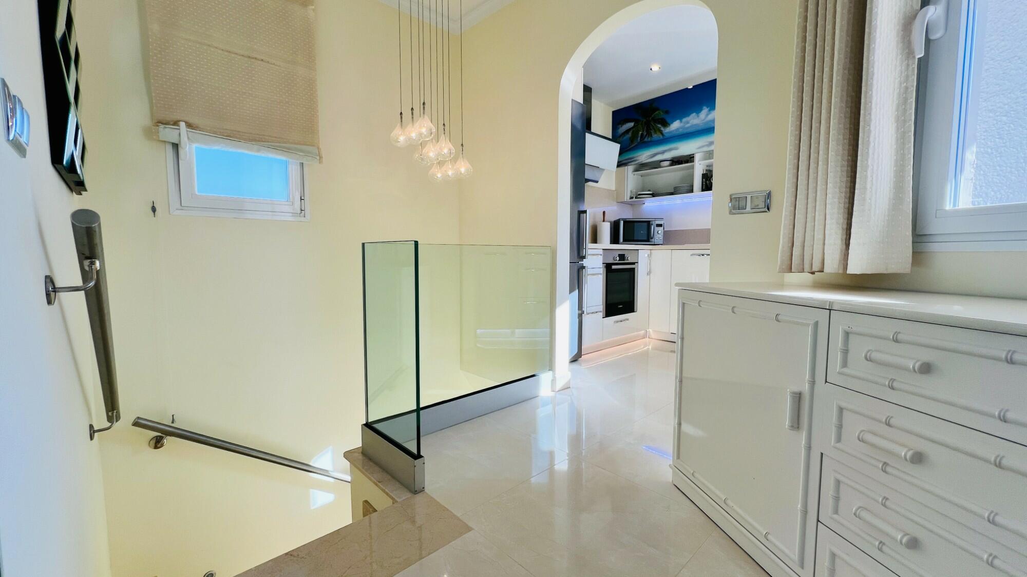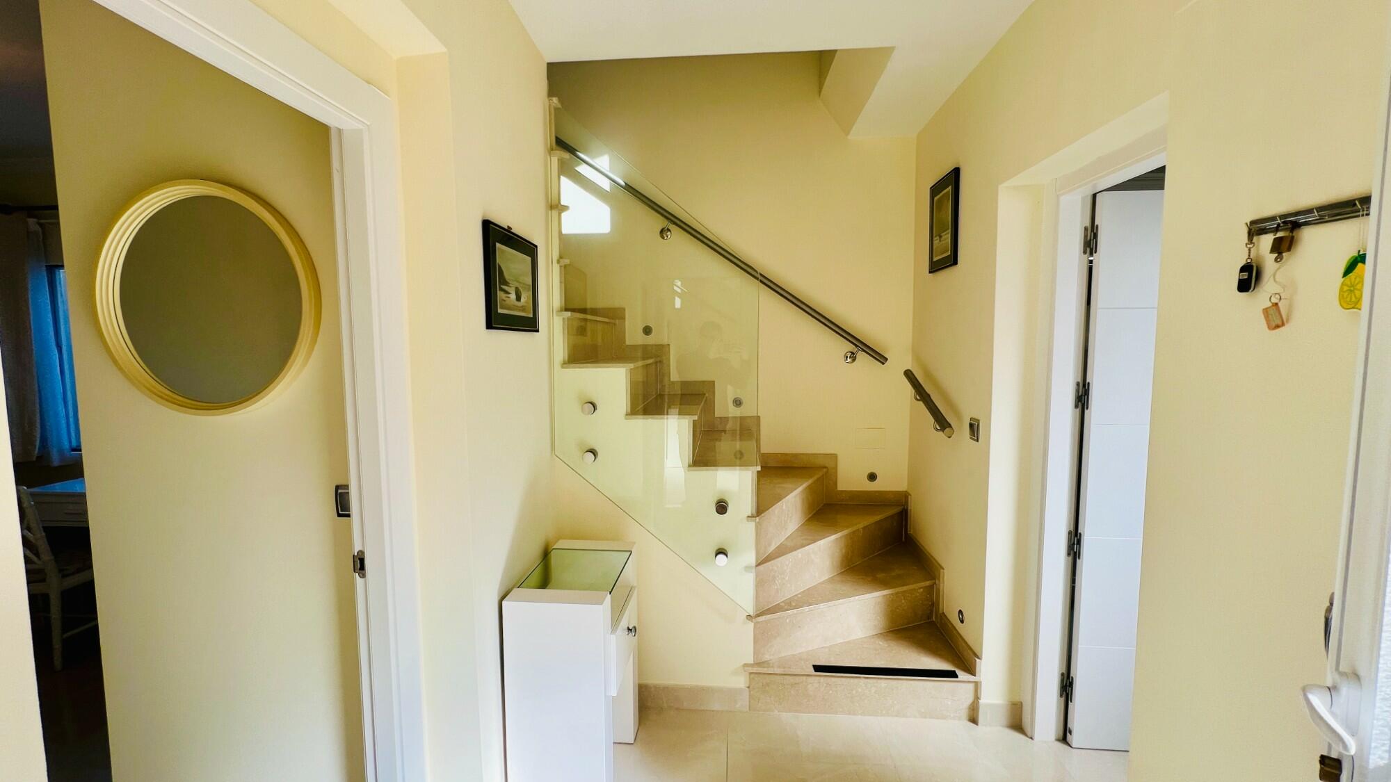Positioned in the middle of the block and spread over two levels, the villa is entered via a covered front porch with a wall light. The fully glazed front door opens into a stylish lower hallway. To the left is the master bedroom, complete with an en-suite shower room featuring a walk-in, non-slip shower with self-cleaning glass, a W.C., a wash hand basin, sleek modern tiling, recessed ceiling lighting, and a frosted window for natural light. The master bedroom itself is fitted with mirrored built-in wardrobes, a ceiling fan, and fully glazed patio doors opening onto a delightful sun terrace with open valley views. Surrounded by hedges within the communal gardens, ensuring privacy. In this space there is also access to the under-build storage room.