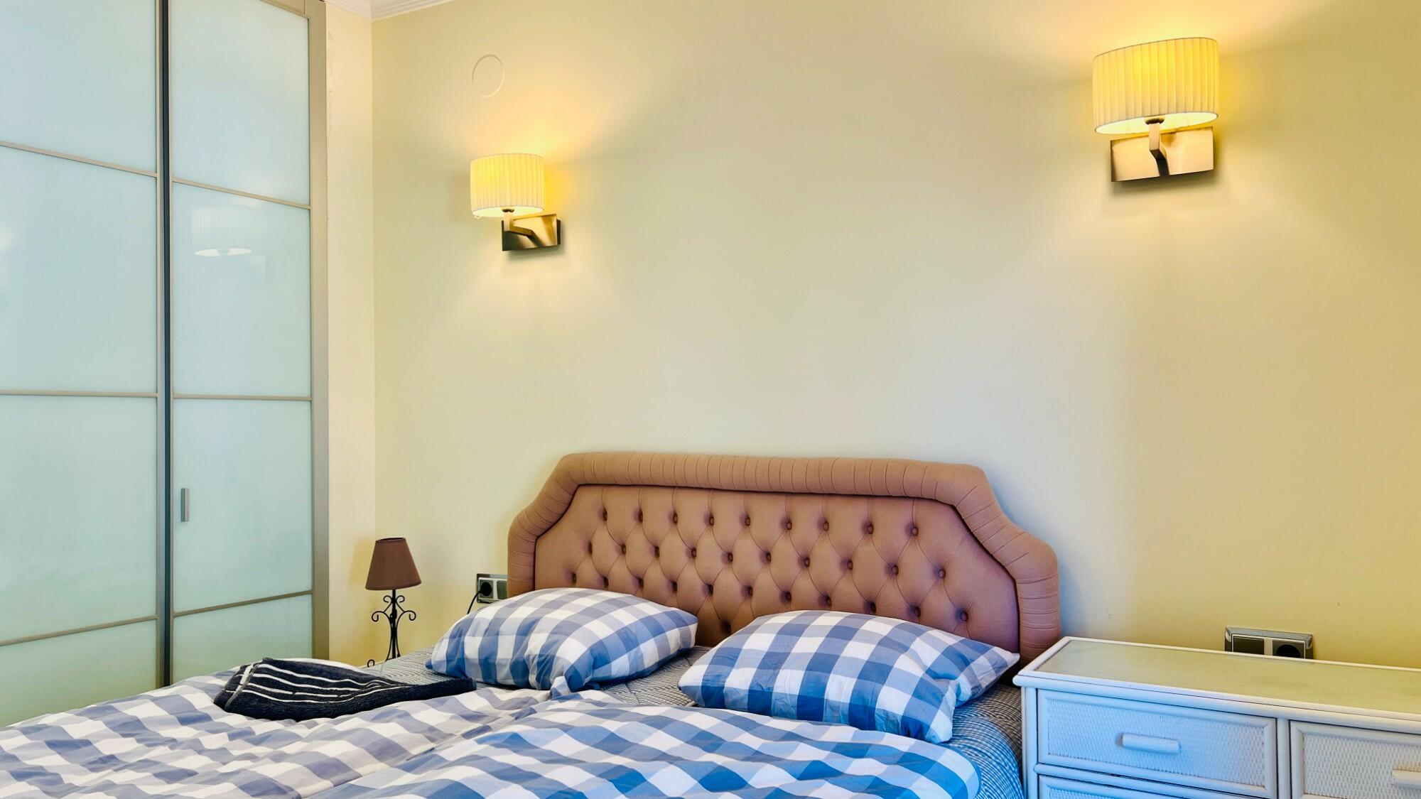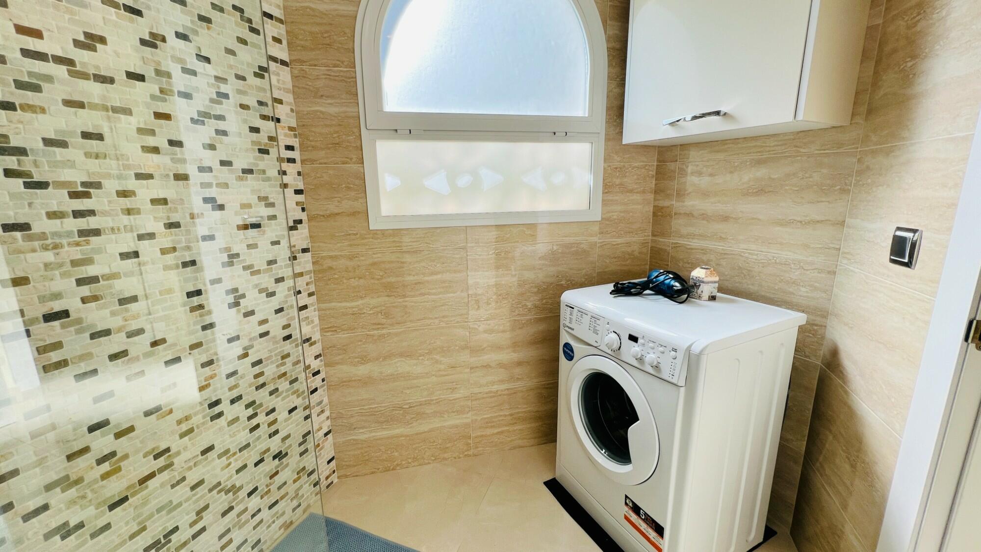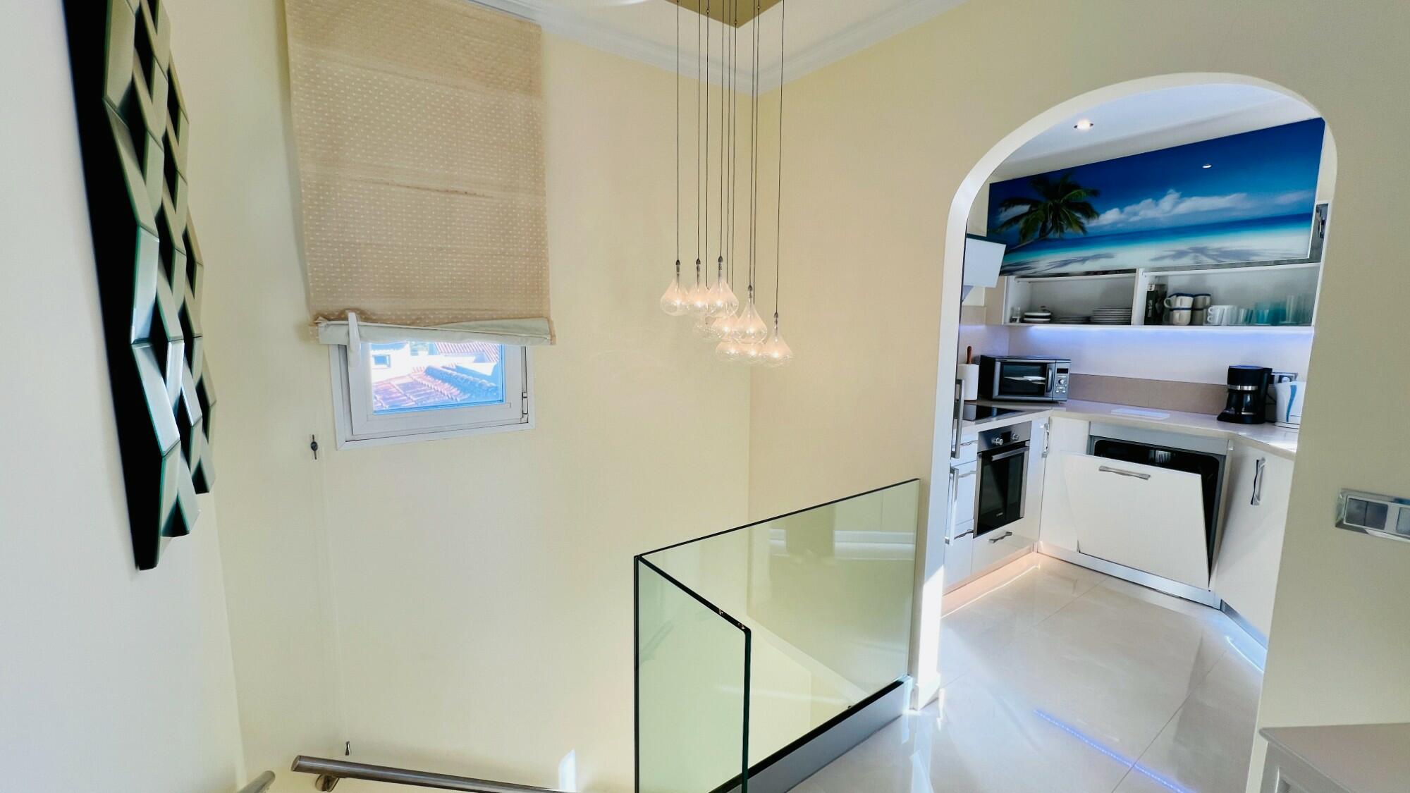 Positioned in the middle of the block and spread over two levels, the villa is entered via a covered front porch with a wall light. The fully glazed front door opens into a stylish lower hallway. To the left is the master bedroom, complete with an en-suite shower room featuring a walk-in, non-slip shower with self-cleaning glass, a W.C., a wash hand basin, sleek modern tiling, recessed ceiling lighting, and a frosted window for natural light. The master bedroom itself is fitted with mirrored built-in wardrobes, a ceiling fan, and fully glazed patio doors opening onto a delightful sun terrace with open valley views. Surrounded by hedges within the communal gardens, ensuring privacy. In this space there is also access to the under-build storage room.