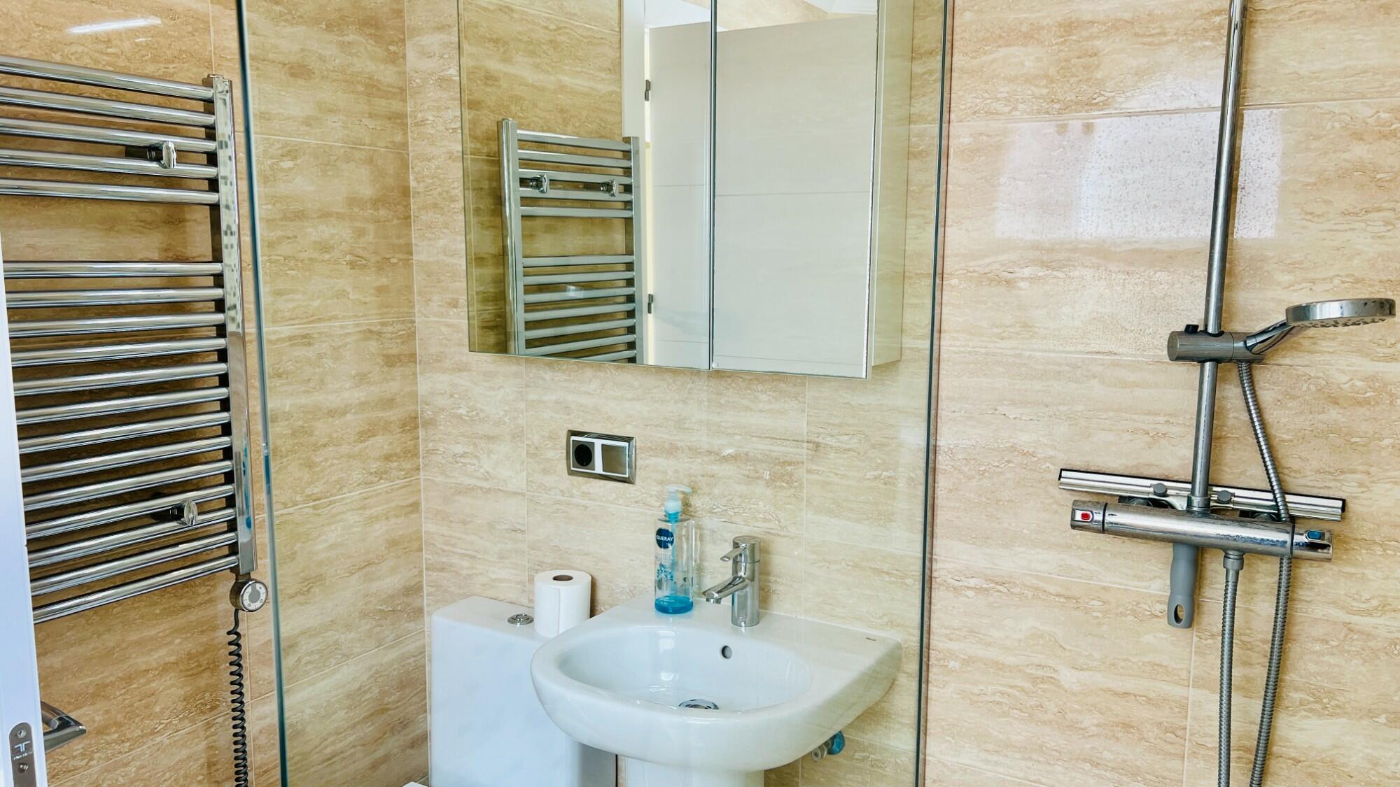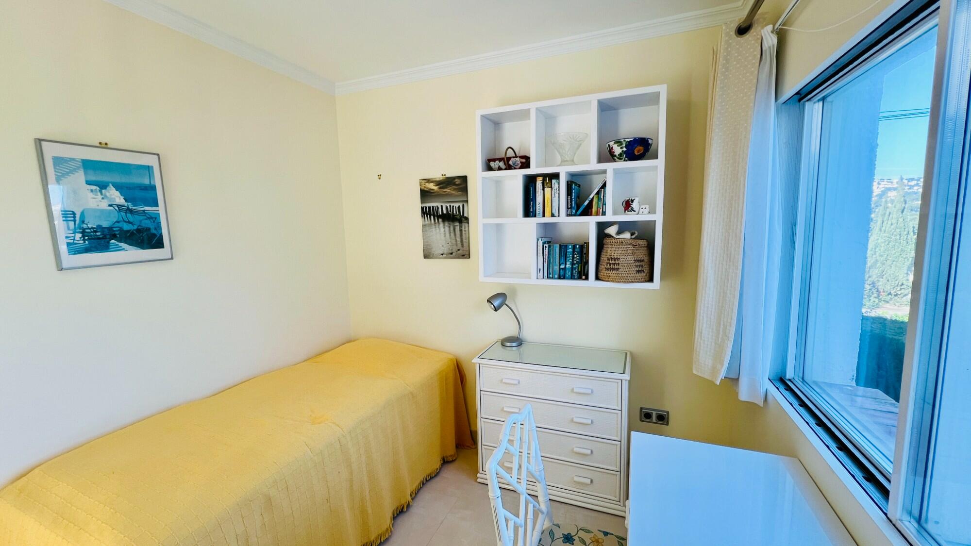Adjacent to the master suite is a fully tiled, modern family shower room, fitted with a W.C., a free-standing hand basin, a walk-in shower, and an electric radiator. To the right of the family shower room is a double bedroom, currently set up with a single bed and office space. It features a step-in cupboard for wardrobe and storage and a large double window that provides lovely views of the valley and communal tennis court.