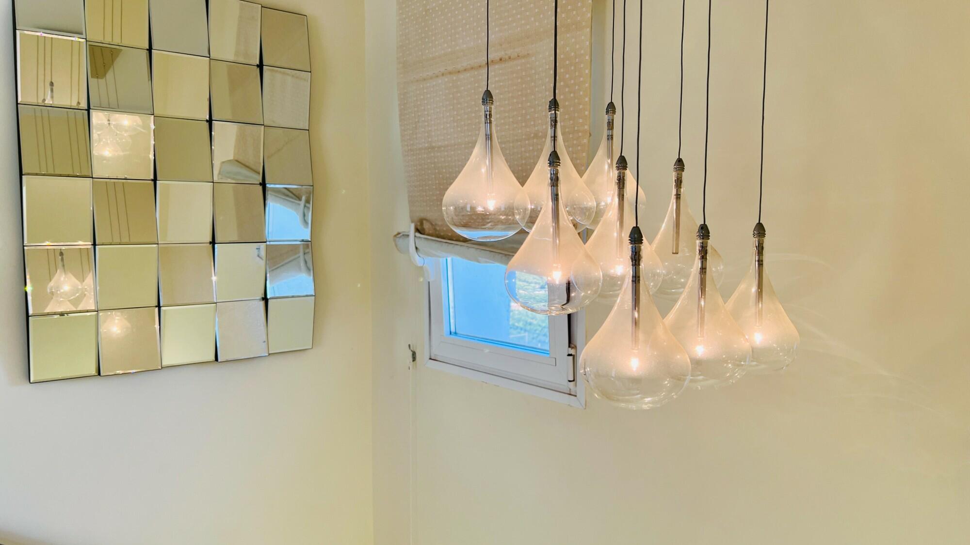 From the lower hallway, a glass and marble staircase with floor-level LED lighting and stylish feature hanging lights leads to the upper level, which comprises an open-plan lounge, dining area, and kitchen. The compact yet well-designed modern galley kitchen is fitted with sleek base and wall units, granite work surfaces, a stainless-steel sink and drainer, an electric oven, a ceramic hob, an extractor fan, and a large fridge-freezer. A built-in dishwasher and a window with views of the communal gardens complete the space. The soft-close cupboards and drawers add to the complete this stylish kitchen.