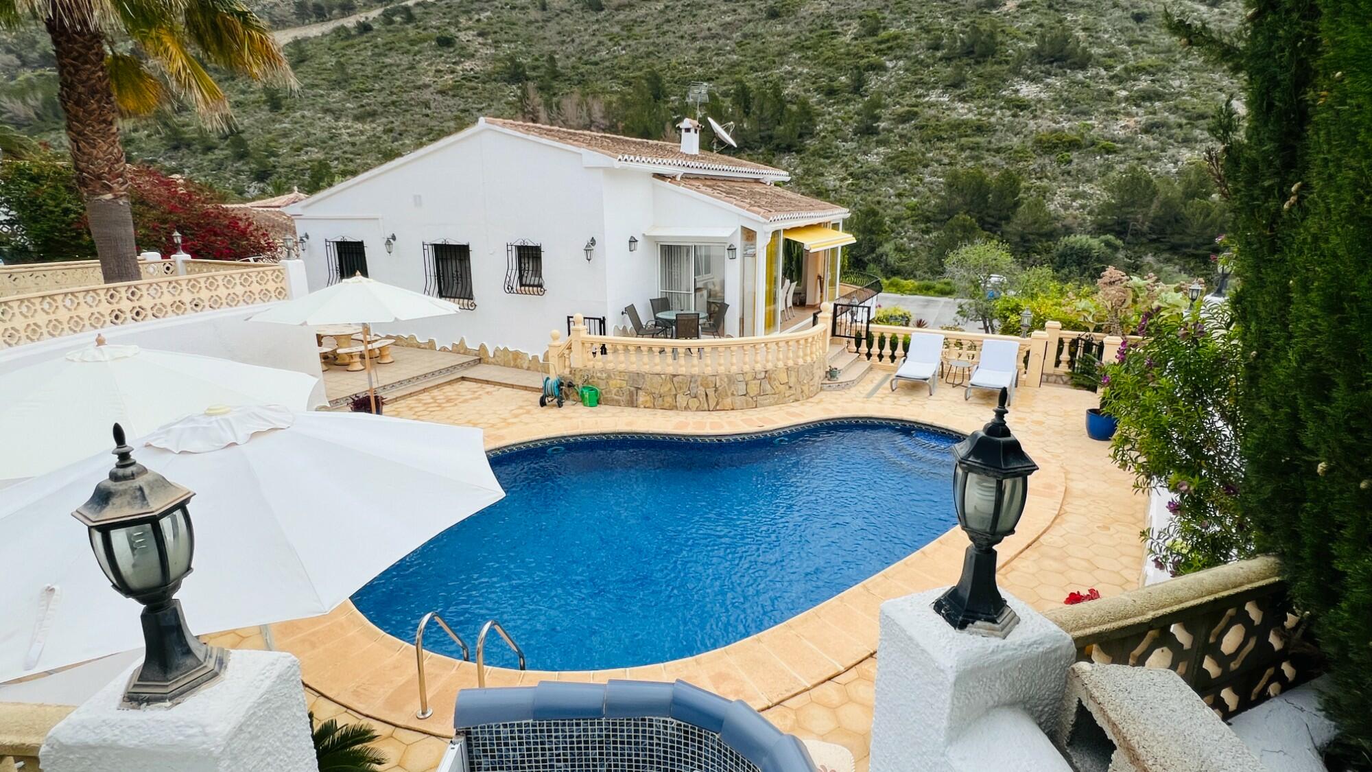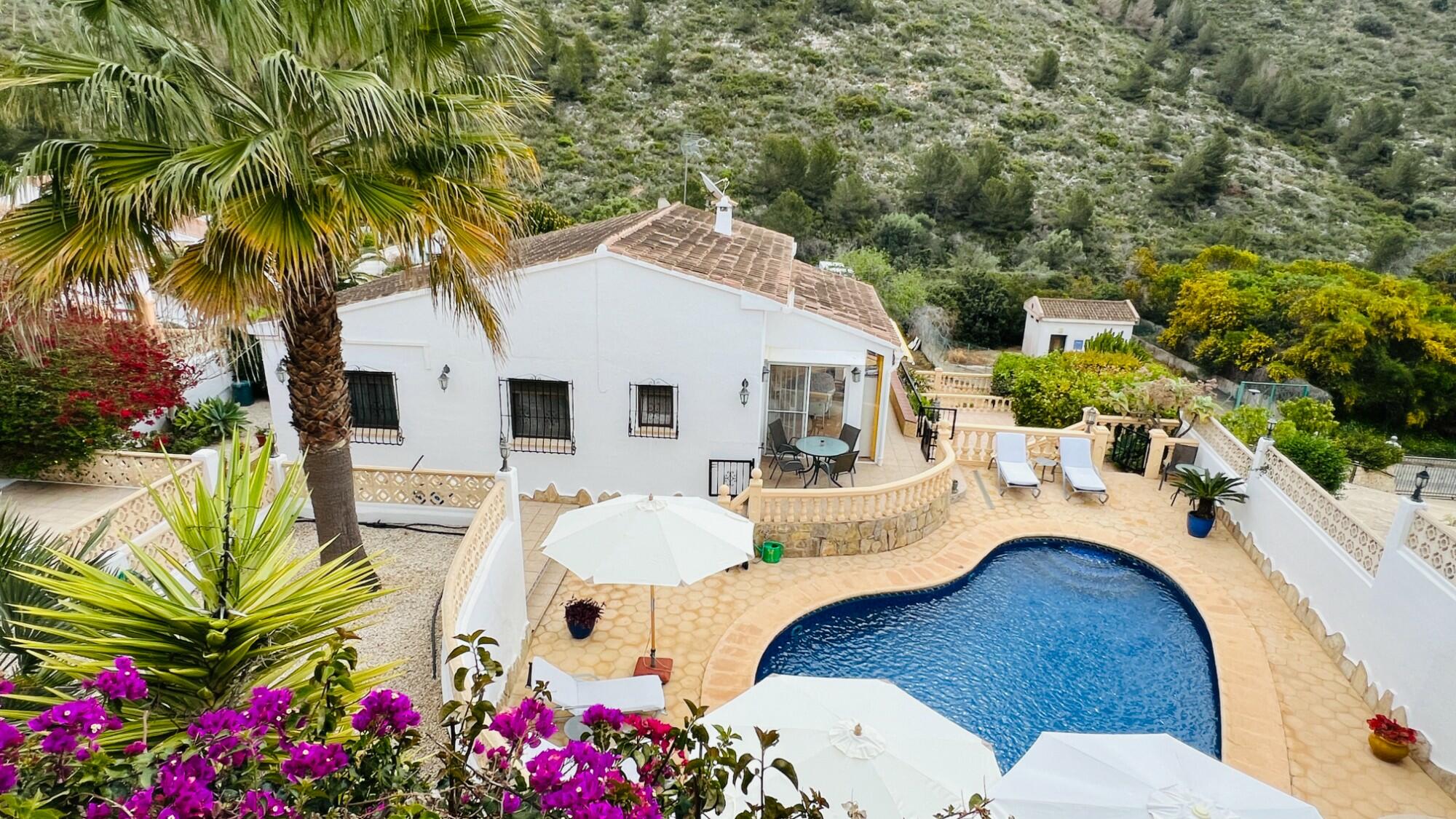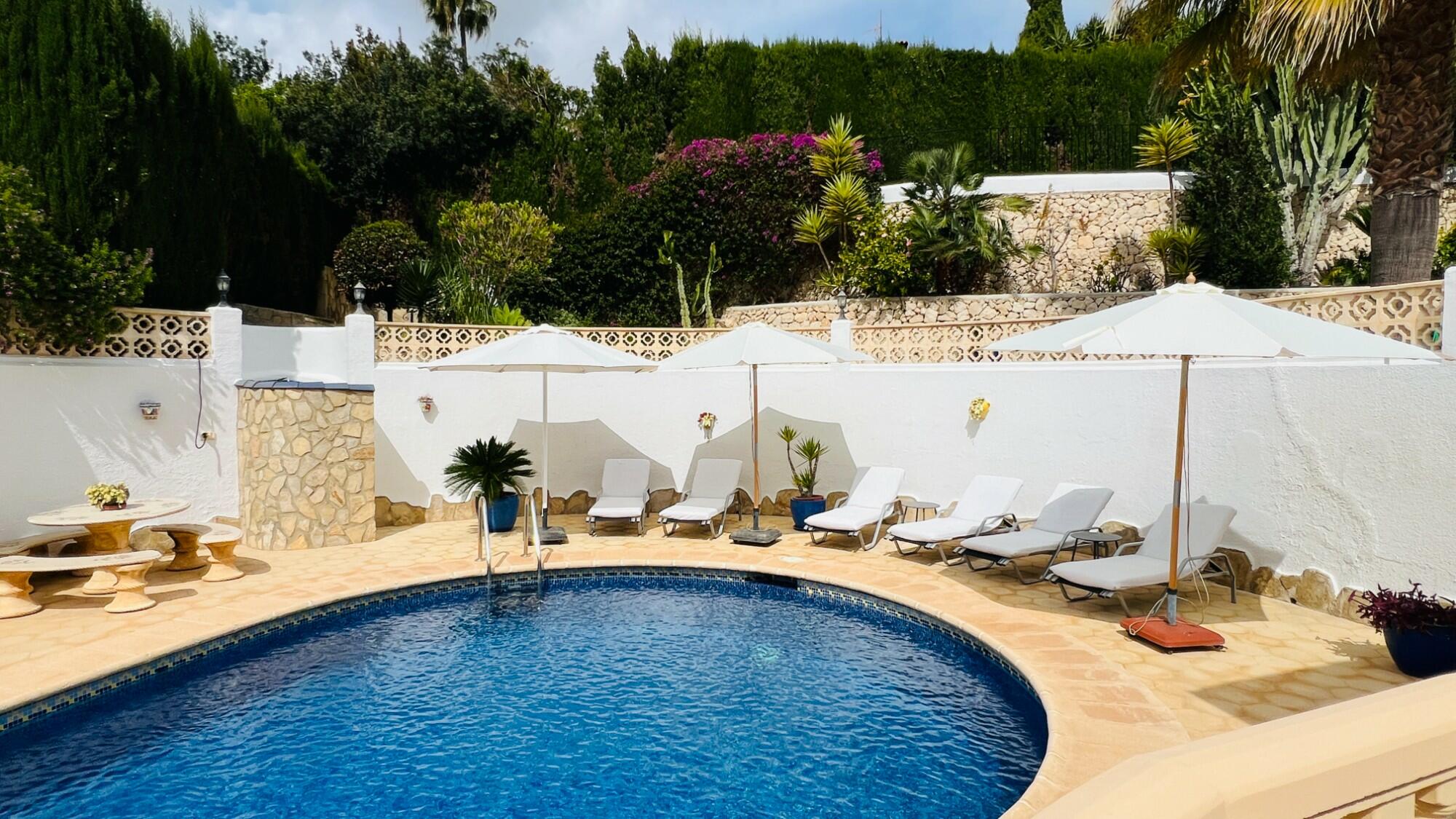 This lovely Spanish villa for sale in Valle del Portet, Benitachellon the outskirts of Moraira,is perfect for those looking for a comfortable family home or holiday retreat. The main house features three bedrooms, while a fourth guest bedroom with its own private entrance is located on the lower level – ideal for visitors or extended family. The private pool is surrounded by generous terraces and attractive, low-maintenance garden areas, offering all day sunshine and shaded corners for relaxing or entertaining. There are safe spaces for younger children to play, making this a lovely choice for families. Just a 2-minute drive away, you will find a large supermarket and local shops, while the centre of Moraira and its beautiful beaches are less than 8 minutes away by car. Well cared for by the current owners as a year-round holiday getaway, the villa is equally suited as a permanent home.