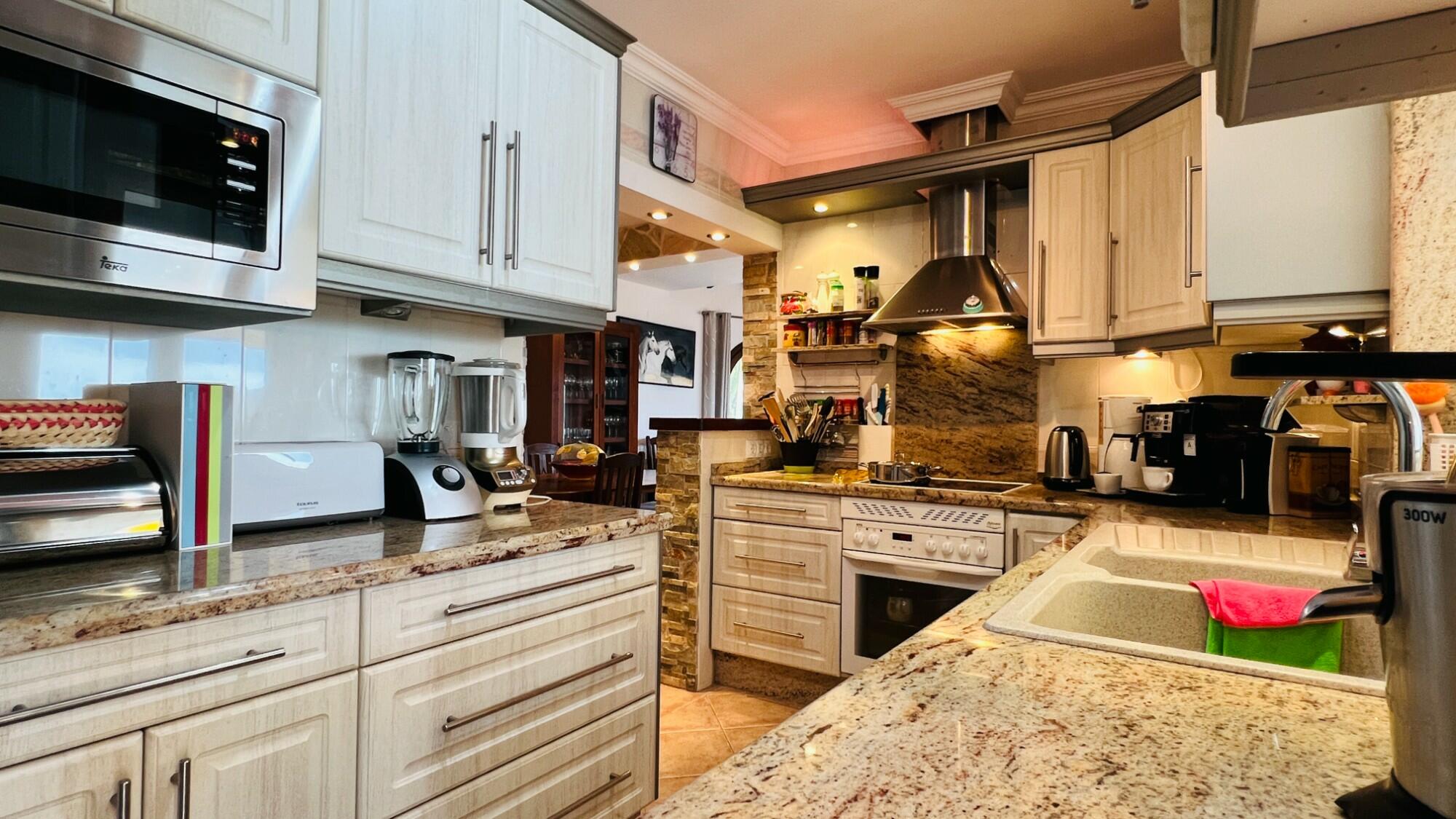Through another slate archway is the hallway that leads to the three generous size bedrooms, one currently configured with twin beds. All benefit from hot and cold air-conditioning and fitted wardrobes. The master bedroom has its own en-suite with both a bath and separate shower. In between the bedrooms is the family bathroom featuring a large step in corner shower and dual basins.