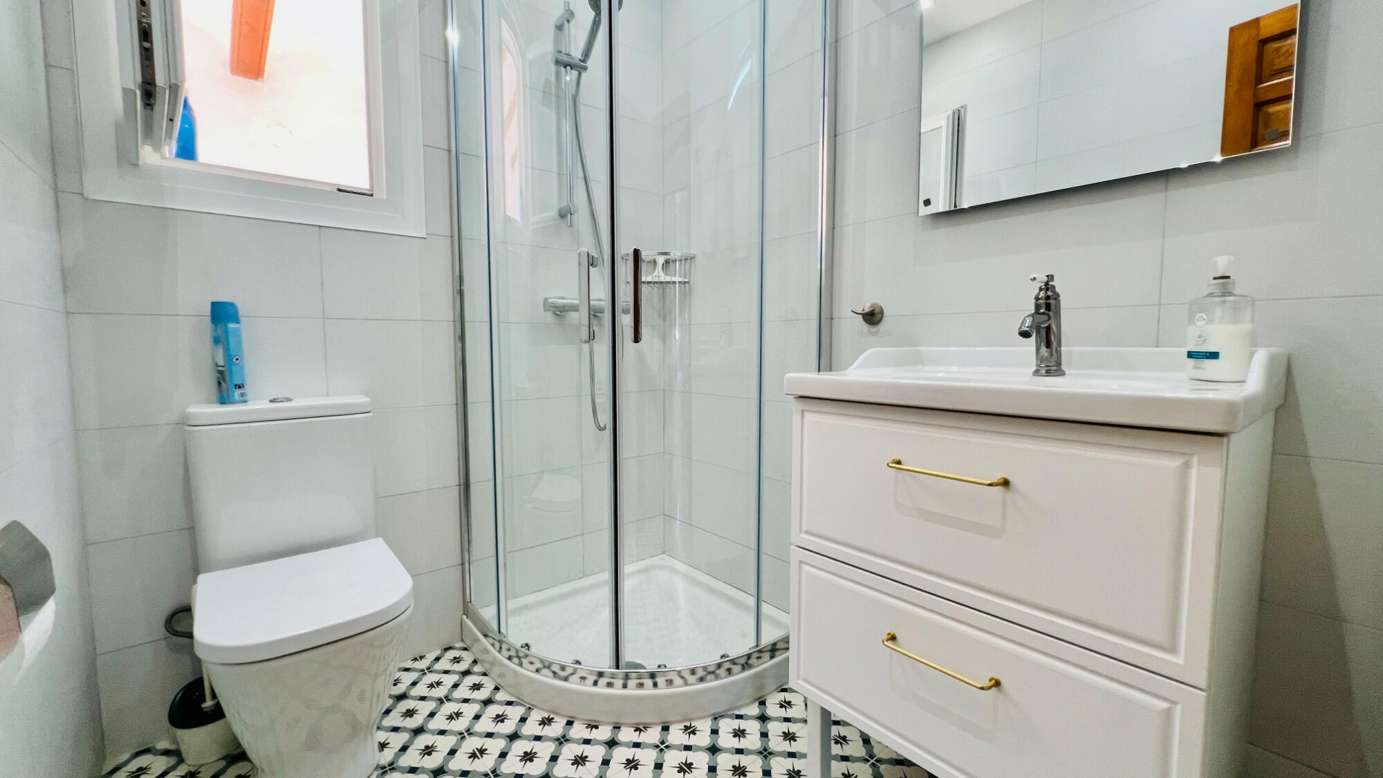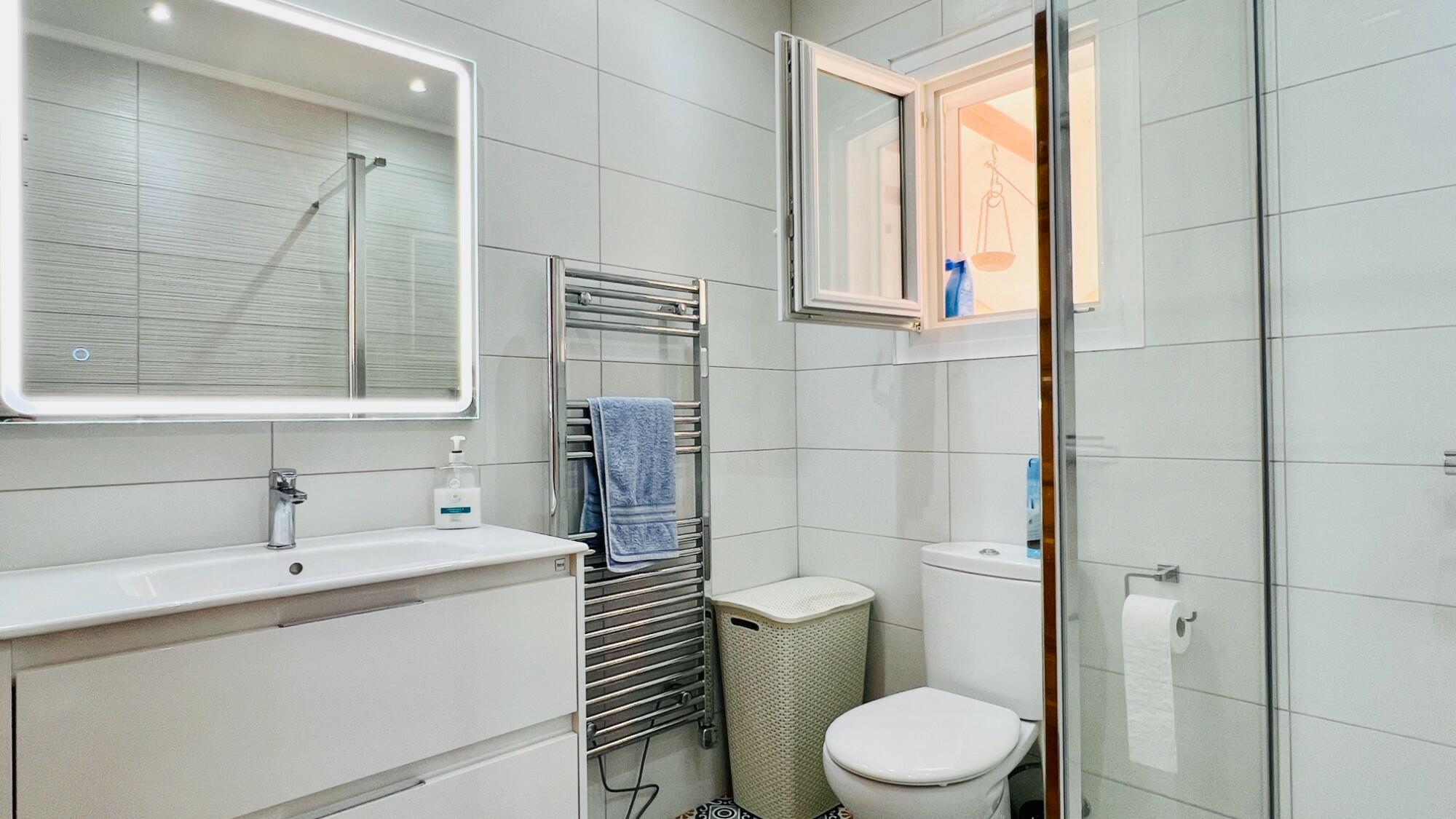 From the main living area, an archway leads to the hallway. On the right is a modern family bathroom with a corner shower, contemporary vanity unit with basin, heated towel rail, and WC. Further along on the left is a double bedroom and at the end of the hall, the master bedroom with its own en-suite bathroom that features a large walk-in shower. Both bedrooms feature fitted wardrobes and ceiling fans.