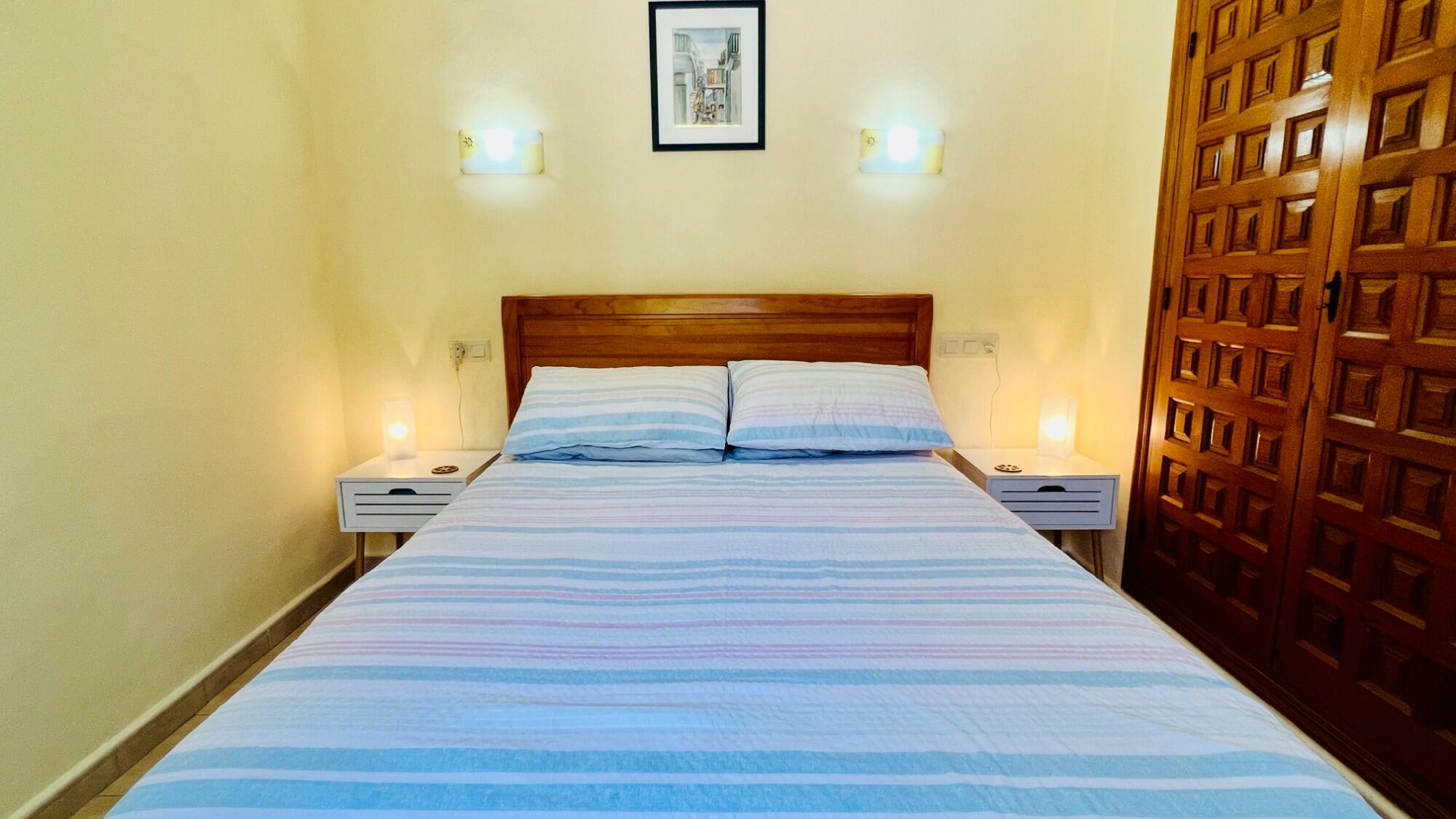 The lounge is light and welcoming with a wood-burning fireplace, ideal for cooler evenings, and also hasgas central heating and air conditioning for year-round comfort. Traditional double doors with rejas lead out to an enclosed circular porch (14m²), a versatile space that could be used as a dining area, a second seating room, or even a guest bedroom for visiting family and friends. Double-glazed windows open to let in the breeze, making it a lovely spot to relax.